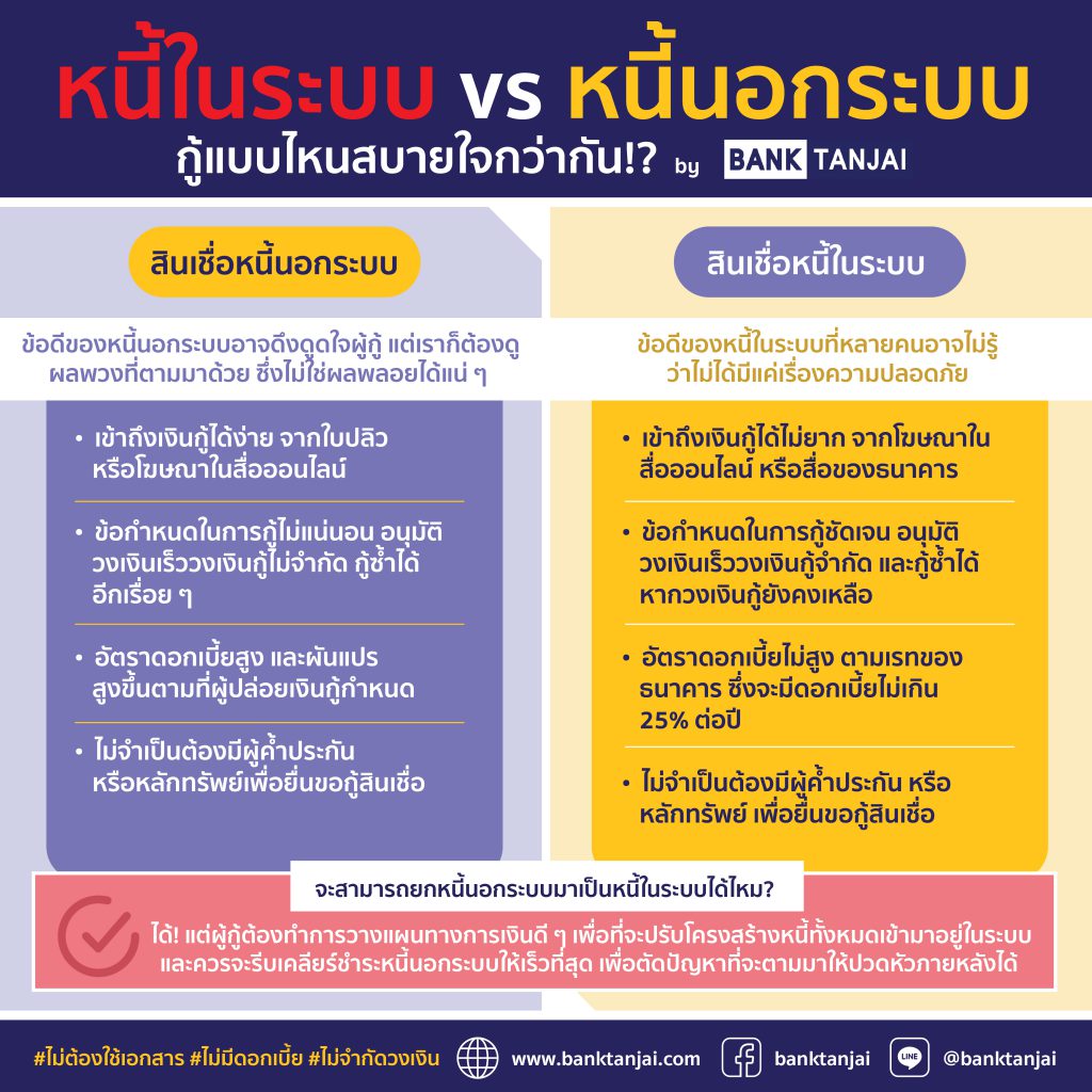 แต่สุดท้ายแล้วทางเลือกในการกู้สินเชื่อในวินาทีเร่งด่วนของหลายคน ที่มั่นใจว่ากู้ง่ายได้เงินไว ก็คงจะไม่พ้นการกู้สินเชื่อนอกระบบ ทั้ง ๆ ที่ยังมีสินเชื่อในระบบที่คุณอาจจะยังไม่รู้จักอีกมากมาย และเป็นทางเลือกที่ปลอดภัย ได้อนุมัติเงินชัวร์ไม่ต่างกัน วันนี้ ‘Bank TanJai’ เลยขอมาเปิดประเด็น เทียบกันให้เห็นชัด ๆ ไปเลยว่า หนี้ในระบบ vs หนี้นอกระบบ ? ต่างกันอย่างไร?